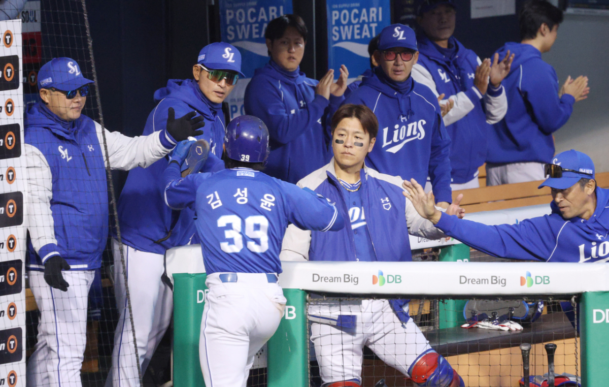 28일 서울 잠실야구장에서 2026 신한 SOL KBO리그 두산 베어스와 삼성 라이온즈의 경기가 열렸다. 삼성 최형우는 4회초 무사 1,3루 상황에서 3루주자 김성윤이 디아즈의 희생 플라이로 선제 득점하는 것을 지켜봤다. 박진만 감독은 득점한 김성윤을 환영했다.