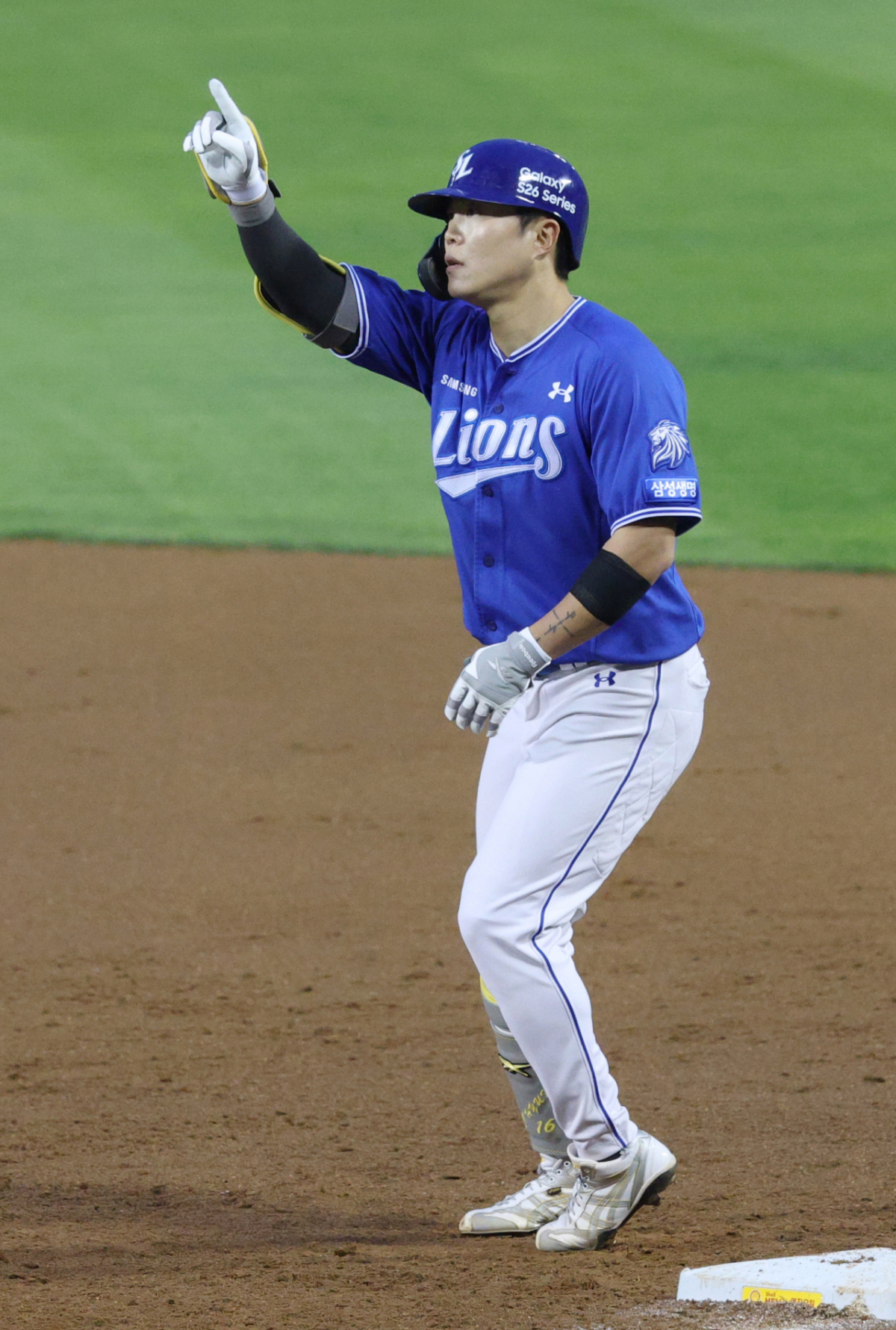 28일 서울 잠실야구장에서 2026 신한 SOL KBO리그 두산 베어스와 삼성 라이온즈의 경기가 열렸다. 삼성 류지혁은 4회초 무사 1사 3루 상황에서 1타점 중전 안타를 기록했다. 그는 안타를 날린 후 출루하여 세리머니를 했다.