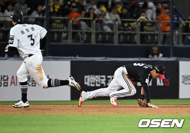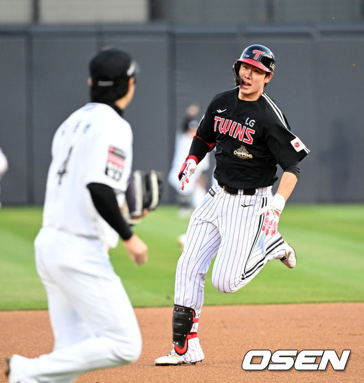 2사 후 문보경이 볼넷을 골라 출루했다. 투수의 원바운드 폭투가 포수 맞고 옆으로 튕기면서 1루주자는 2루로 진루했다. 송찬의가 좌익수 앞 안타를 때렸고, 2루주자는 3루에 멈췄다. 홈 송구 때 타자주자는 2루까지 뛰었다.