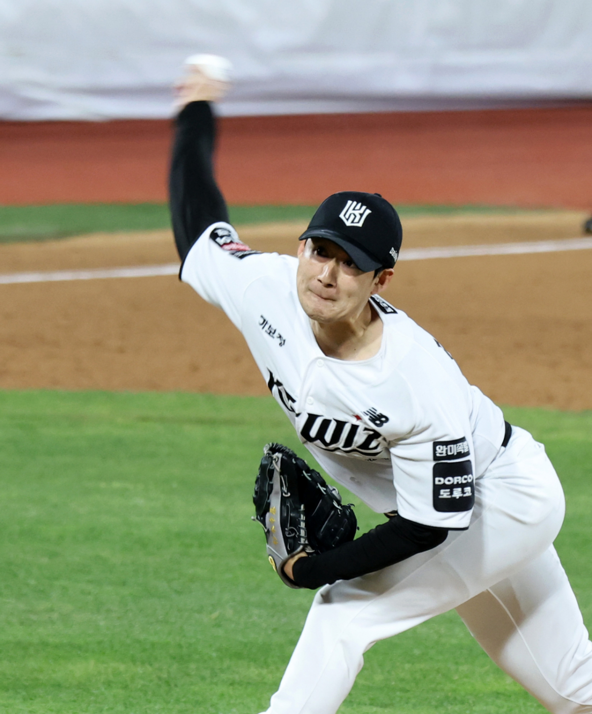 KT 우완불펜 스기모토가 28일 수원KT위즈파크에서 열린 2026KBO리그 LG트윈스와 KT위즈 경기 7회초 무실점으로 마무리하고 있다. 2026.04.28.