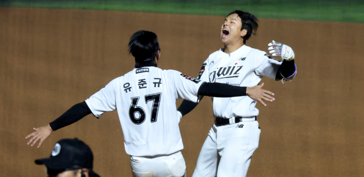 KT 강민성이 28일 수원KT위즈파크에서 열린 2026KBO리그 LG트윈스와 KT위즈 경기 10회말 첫타석에서 끝내기 안타를 터트린 후 환호하고 있다. 2026.04.28.