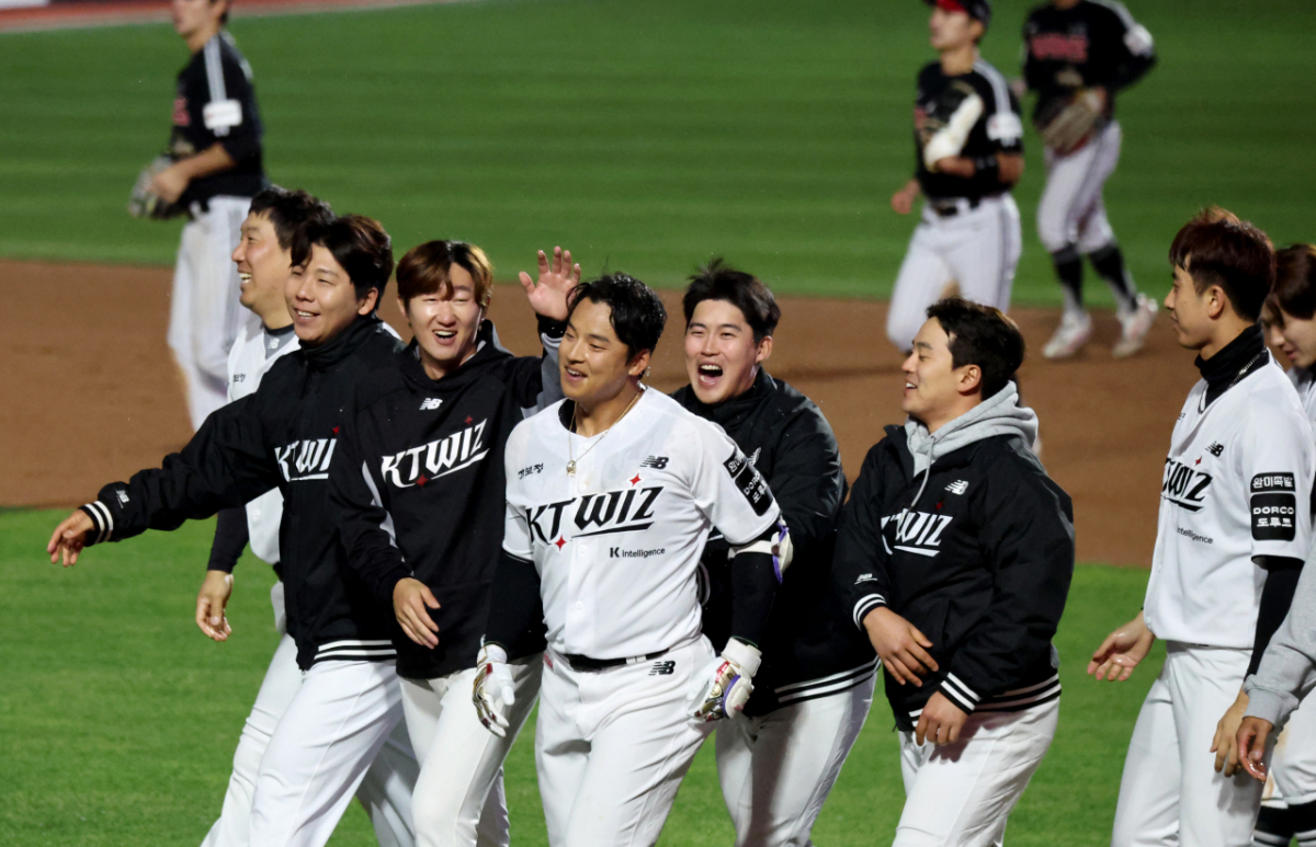 KT 강민성이 28일 수원KT위즈파크에서 열린 2026KBO리그 LG트윈스와 KT위즈 경기 10회말 첫타석에서 끝내기 안타를 터트린 후 환호하고 있다. 2026.04.28. 독자들의 PICK! 김신영, 8년 열애 끝 결별 고백…"전남친 어머니와는 계속 연락" 박지윤 루머 유포자=전남편 최동석?...누리꾼 고소했더니 "맨날 씨뿌리고 다녀" 박정수, 75세에 늦둥이 본 김용건 '일침' '병든 남편' 학대하는 아내..."엄마는 아빠 버려도 돼" 아들의 눈물
