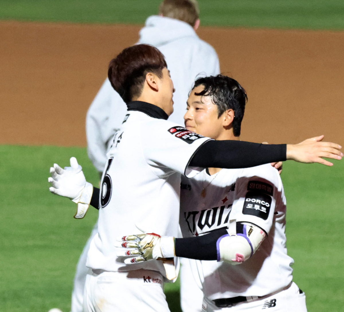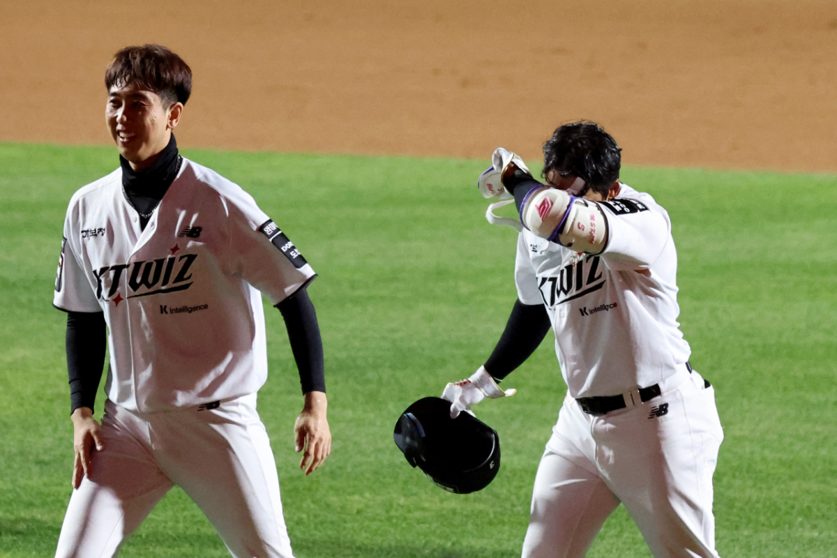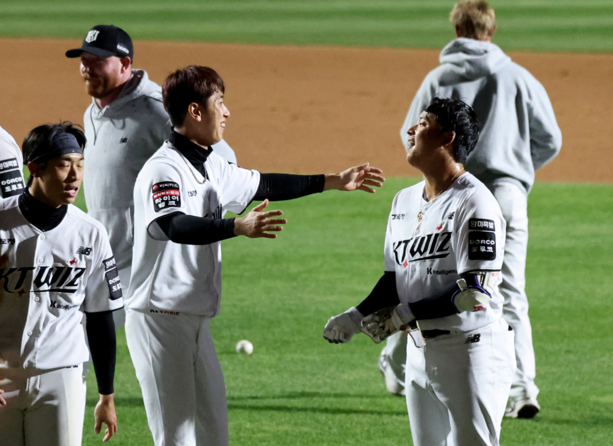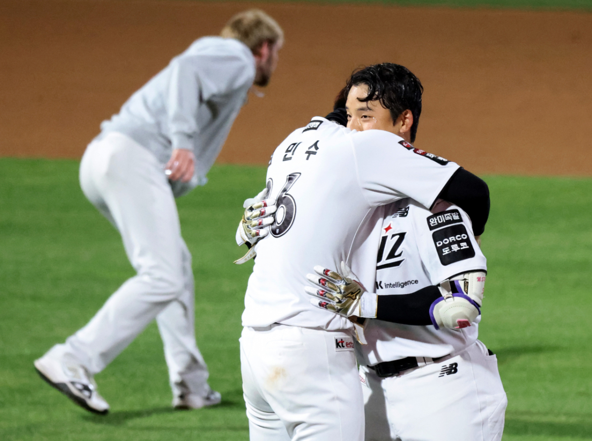 KT 강민성이 28일 수원KT위즈파크에서 열린 2026KBO리그 LG트윈스와 KT위즈 경기 10회말 첫 타석에서 끝내기 안타를 터트렸다. 강민성은 끝내기 안타를 터트린 후 환호했다. 이로써 경기는 KT 위즈의 승리로 끝났다. KT 강민성이 28일 수원KT위즈파크에서 열린 2026KBO리그 LG트윈스와 KT위즈 경기 10회말 첫타석에서 끝내기 안타를 터트린 후 환호하고 있다. 2026.04.28. 독자들의 PICK! 김신영, 8년 열애 끝 결별 고백…"전남친 어머니와는 계속 연락" 박지윤 루머 유포자=전남편 최동석?...누리꾼 고소했더니 "맨날 씨뿌리고 다녀" 박정수, 75세에 늦둥이 본 김용건 '일침' '병든 남편' 학대하는 아내..."엄마는 아빠 버려도 돼" 아들의 눈물