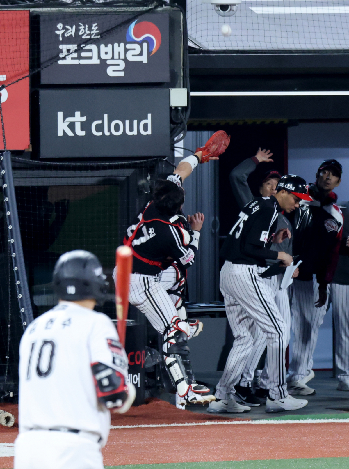 LG 안방마님 박동원이 포8일 수원KT위즈파크에서 열린 2026KBO리그 LG트윈스와 KT위즈 경기 9회말 2사 만루 한점을 이기고 있는 상황에서 김현수의 파울타구를 아깝게 놓치고 있다. 박동원이 이 파울타구를 잡았다면 10회말 끝내기패는 없었을텐데...... 2026.04.28.