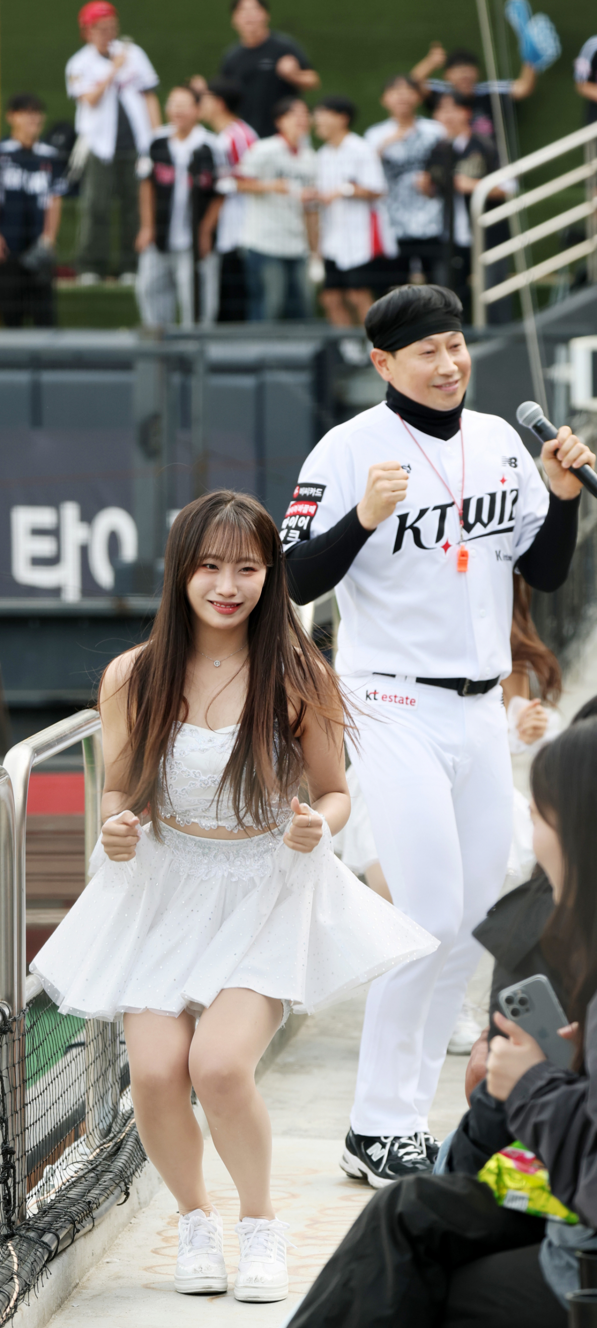 KT 치어리더 이서윤과 응원단장 김주일이 29일 수원KT위즈파크에서 열린 2026KBO리그 LG트윈스와 KT위즈 경기에 앞서 일찌감치 야구장을 찾은 팬들에게 응원곡을 소개하며 율동을 함께하고 있다. 2026.04.29.