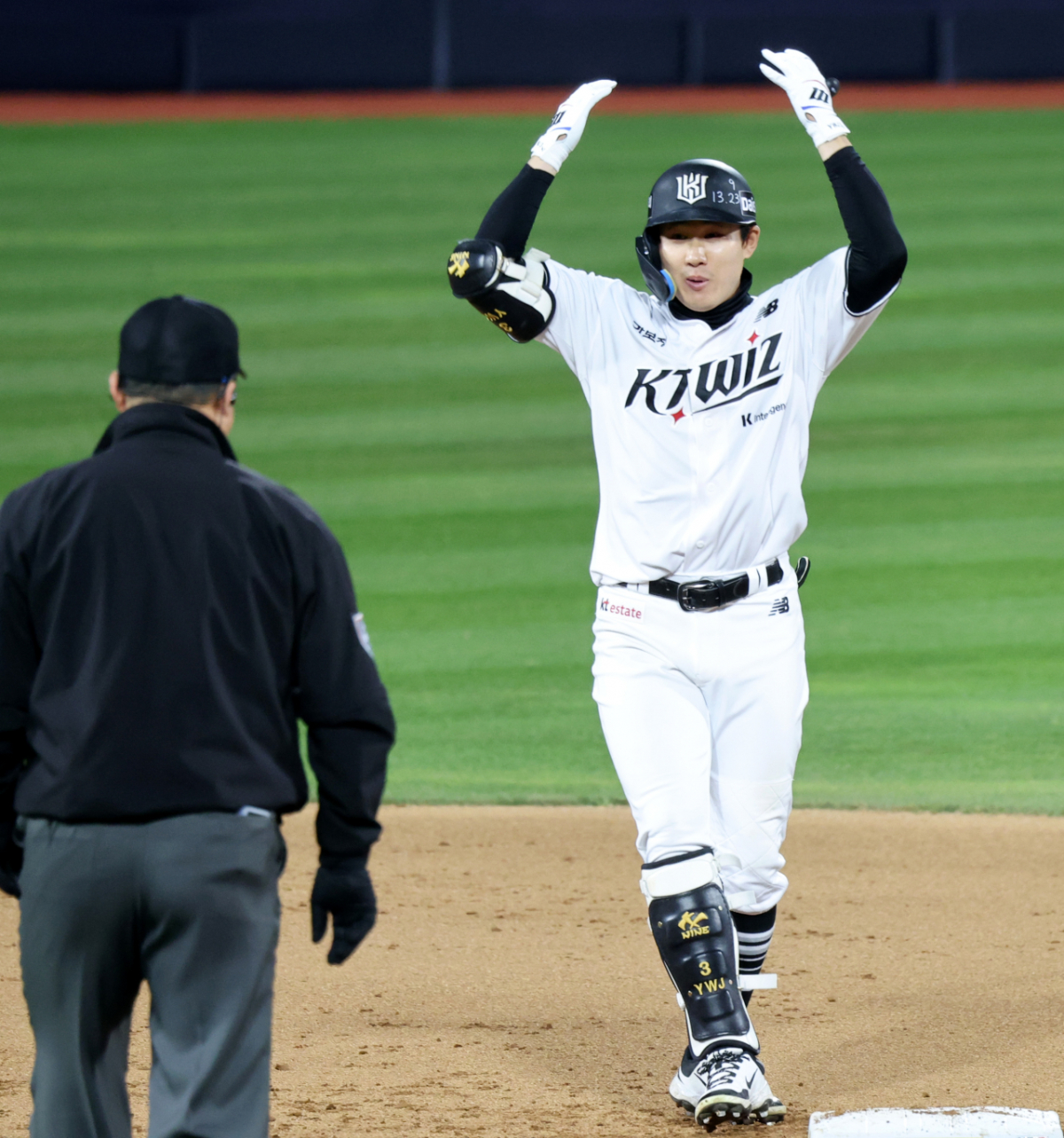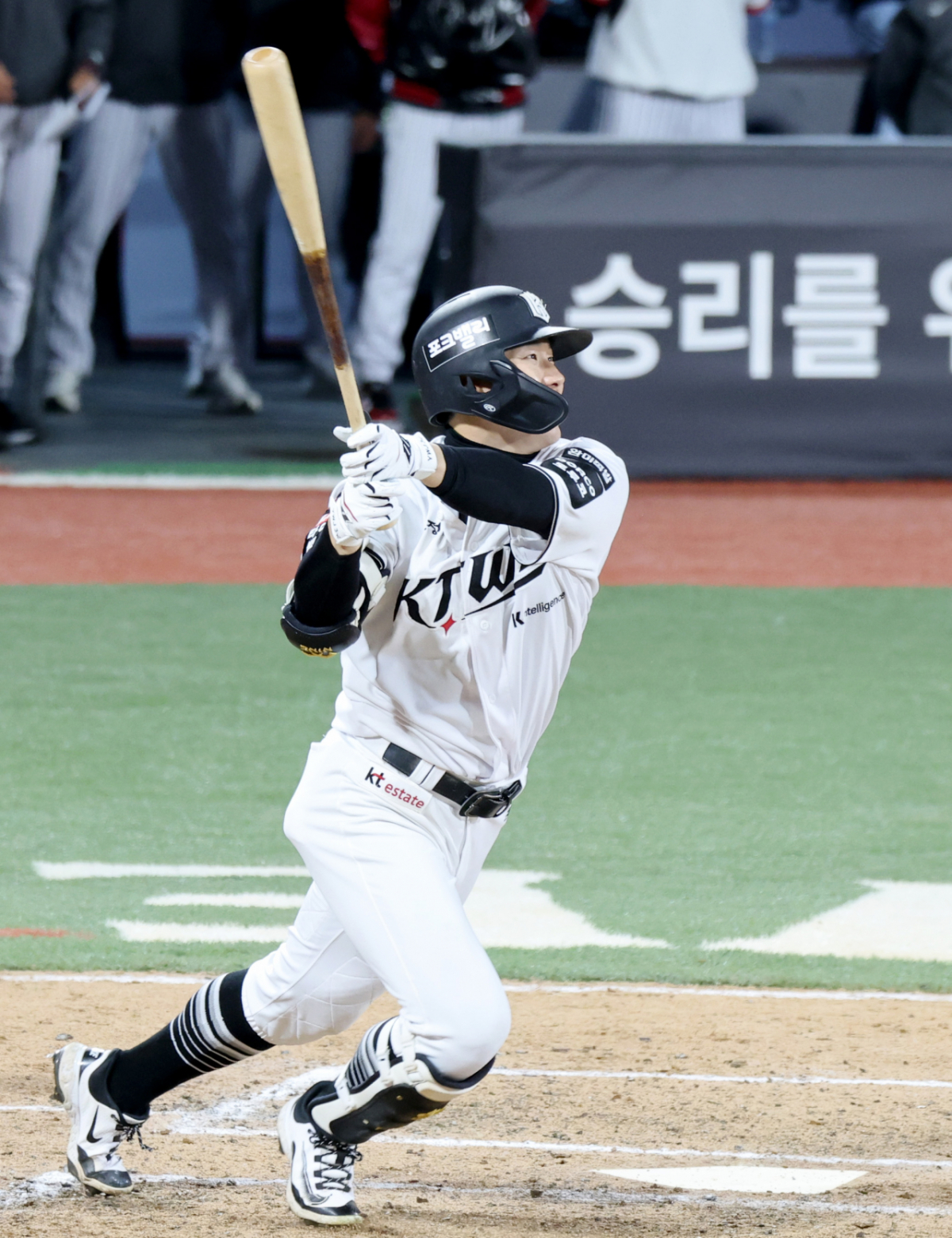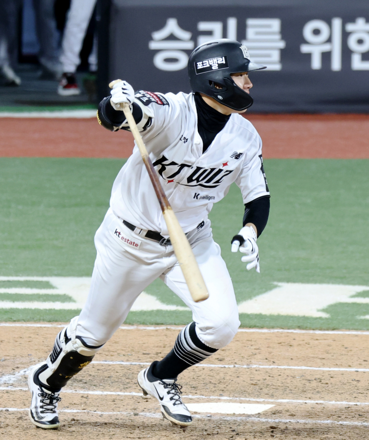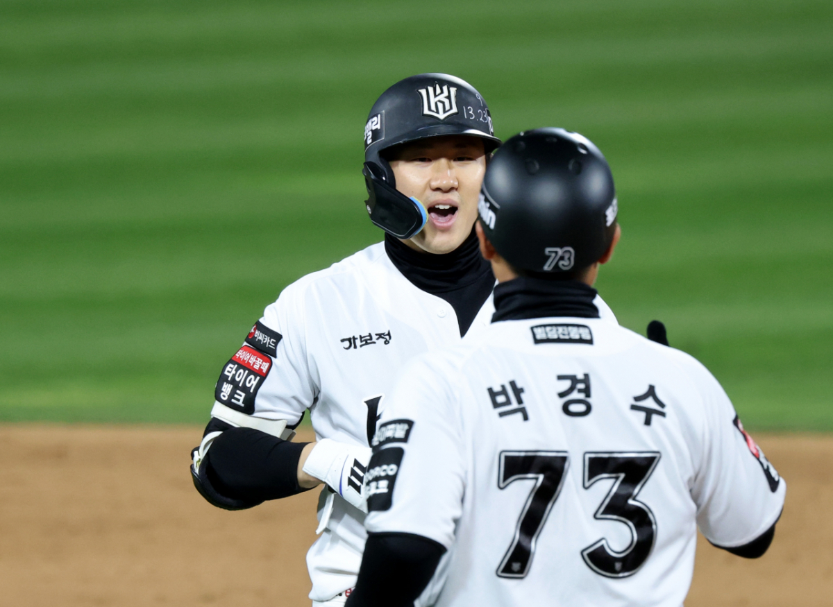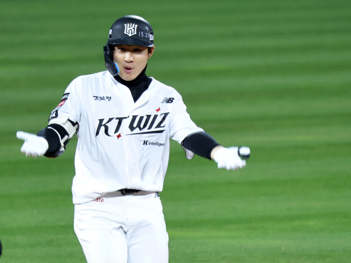 KT 2번타자 최원준이 30일 수원KT위즈파크에서 열린 2026KBO리그 LG트윈스와 KT위즈 경기 6회말 2사 1, 2루에서 2타점 2루타로 출루하고 있다.