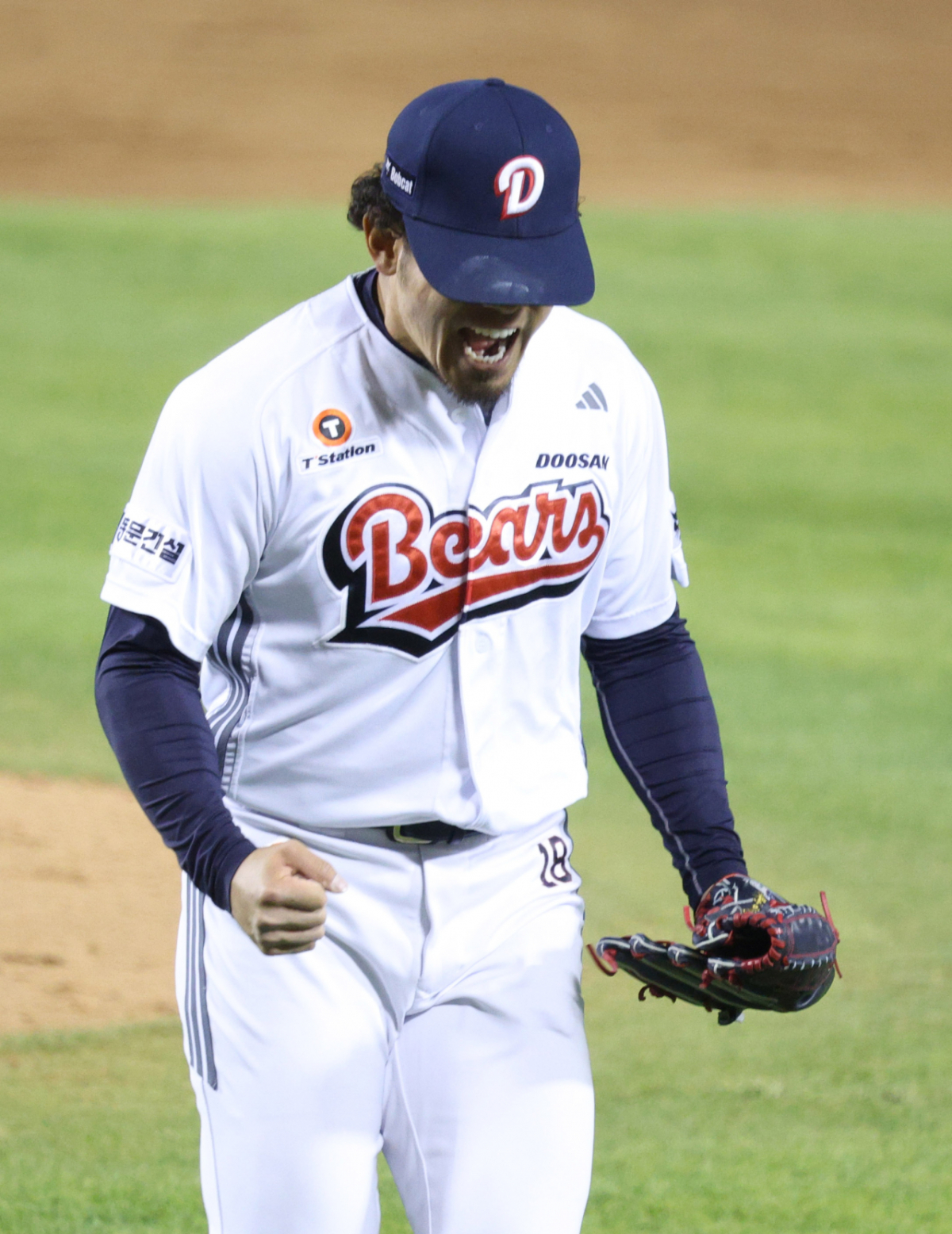 두산 타무라가 5회초 2사 3루에서 삼성 전병우를 삼진으로 돌려세운고 환호하고 있다.