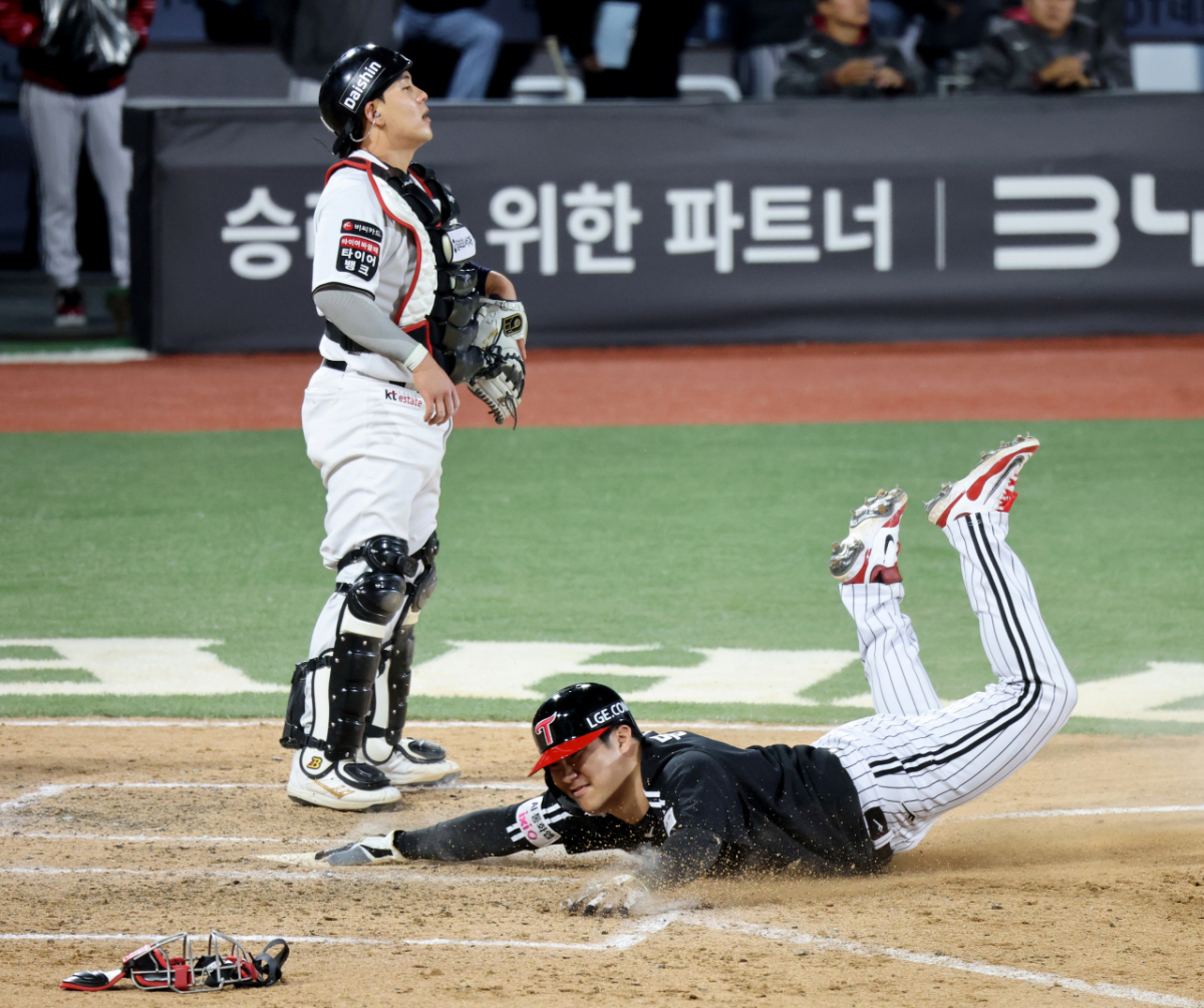 LG 박해민이 30일 수원KT위즈파크에서 열린 2026KBO리그 LG트윈스와 KT위즈 경기 8회초 2사 2루에서 안타를 터트리지 2루주자 문보경이 동점득점을 하고 있다. 헤드퍼스트슬라이딩으로.....2026.04.30