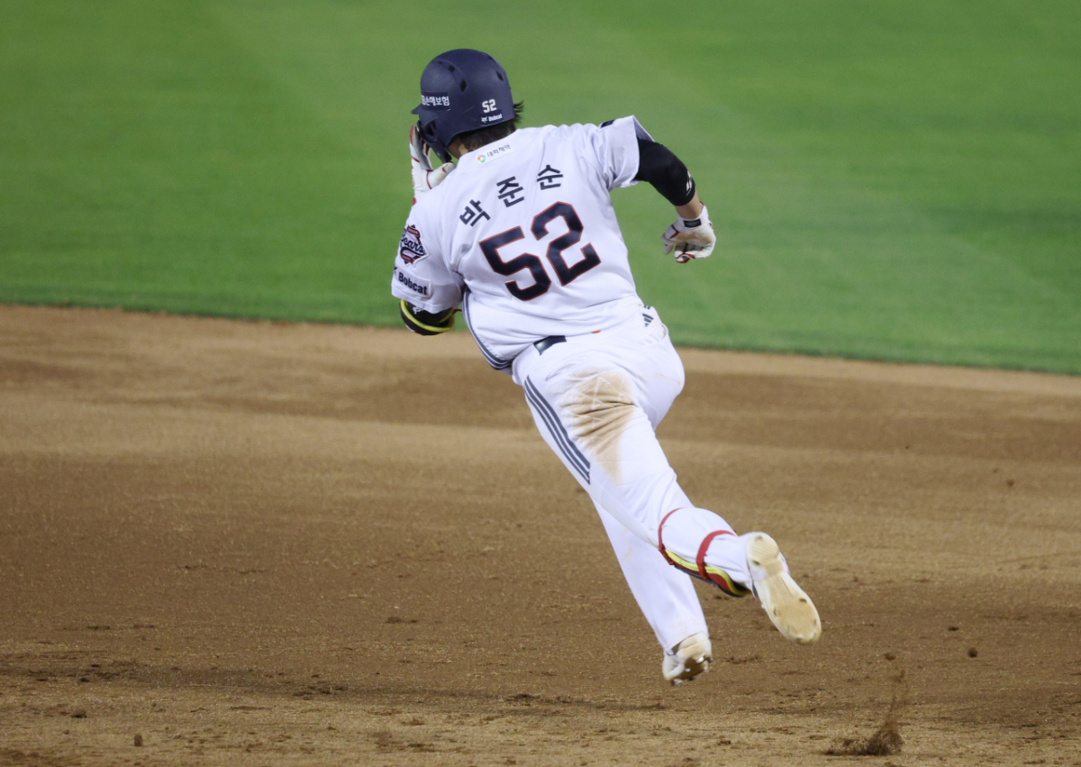 두산 박준순이 8회말 2사 만루에서 주자일소 역전 3타점 적시 2루타를 날리고 질주하고 있다.