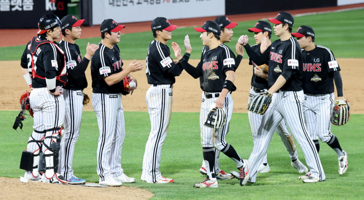 LG 마무리 함덕주와 선수들이 30일 수원KT위즈파크에서 열린 2026KBO리그 LG트윈스와 KT위즈 경기 9회말 수비를 마치며 자축하고 있다. 2026.04.30