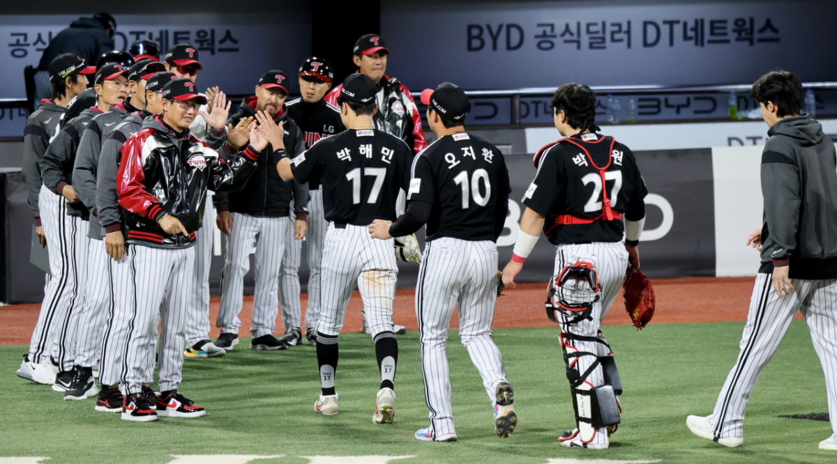 LG 염경엽 감독과 선수들이 30일 수원KT위즈파크에서 열린 2026KBO리그 LG트윈스와 KT위즈 경기 9회말 수비를 마쳤다. 그들은 경기를 마치며 자축했다. 염경엽 감독의 얼굴에는 미소가 흘렀다.