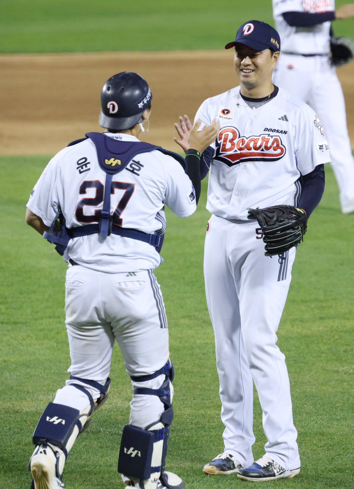 두산 이영하가 9회 구원 등판, 경기를 매조지한 후 포수 윤준호와 기쁨을 나누고 있다.