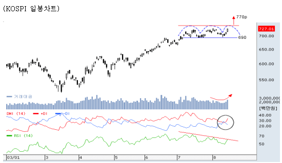 KOSPI는 올 들어서만 7월 이후 3번째로 연중 최고수준에 접근하여 신고가 갱신 가능성 증가하고 있다. 패턴분석상 690p~730p의 박스권을 상향돌파하는 패턴과 하락형 Triple Top패턴의 가능성이 동시에 내재되었는 상황이다. 그러나 거래대금이 재차 상승하면서 기술적지표들이 개선되고 있어 7월중순 고점과 8월초 고점과는 다른 양상을 보이고 있다. 대표적으로 DMI차트의 +DI가 -DI와 일시적인 하향교차가 나타난 후 재차 상승돌파하는 상승 Retesting이 발생하여 상승추세 연장 가능성을 시사하고 있다. RSI가 하락추세선을 극복할 가능성이 높아진 가운데 지수가 전고점인 730수준을 돌파할 경우 박스권 상향돌파에 따른 패턴의 상승목표치는 770p이다. 더구나 변동성지표인 St-Dev가 9.2수준까지 하락하였다가 재차 상승하여 10수준을 넘어서고 있어 변동성확장에 따른 새로운 방향성 설정 가능성에 주목해야 한다