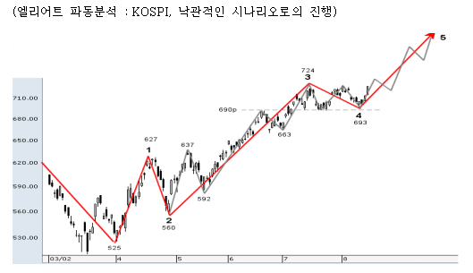 지난 주에 언급한 엘리어트 파동분석상 690수준에서 지지가 확인됨에 따라 비관적인 시나리오가 아닌 낙관적인 시나리오로 시장흐름 전개중이다. 즉, 중기 Primary Cycle 상승1파가 진행중. 하위파동인 Intermediate Cycle 조정4파가 Zig-Zag패턴으로 마무리되고 상승5파가 진행될 가능성이 상당히 높아졌다. 만약 지수가 전고점 돌파할 경우 이를 낙관적 시나리오의 상승5파의 진행으로 인식해야 하며, 상승5파의 상승목표치는 795p이다.