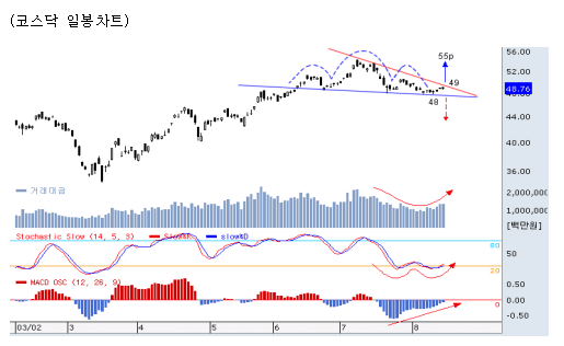 한편, 상대적으로 약세를 보였던 코스닥시장은 상승형 Wedge Formation과 하락형 Head & Shoulder패턴의 진행 가능성이 동시에 상존한 상황으로 만약 저항선인 49p를 상향돌파할 경우 상승목표치는 55p이다. 지난 주 중반 20일-60일 데드크로스가 발생하여 우려감이 증가 하였으나 상승국면하에서의 데드크로스 조건인 거래량이 증가하면서 스토캐스틱의 Bottom Failure Swing패턴이나 MACD오실레이터의 Divergence패턴 등 추세강화패턴이 나타나 기술적 지표가 개선되는 양상을 보이고 있어 상승추세 강화양상으로 전개될 가능성에 주목해야 한다