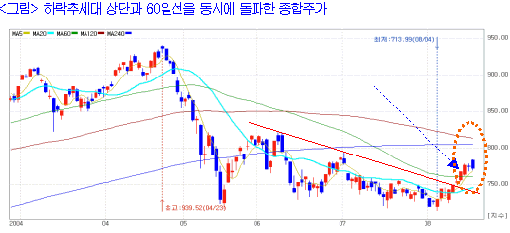 7월 중반이후 지속된 외국인 매수와 지난주 콜금리를 계기로 720~760선에서 맴돌던 종합주가지수 박스권은 한 단계 올라갔다. 매물집중 구간인 760을 돌파하며 박스권 위로 올라섰는데, 여기서 다시 760선 아래로 밀려나지 않는다면 790 정도, 아주 긍정적으로 봐서 810까지 상승을 기대해볼만 하다.
