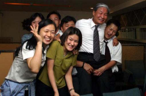 [사진]2003년 6월15일 박무 대표(오른쪽 두번째)가 본사 6기 견습기자들의 탈(脫) 견습행사에 참석, 30년 후배들을 격려하고 있다.