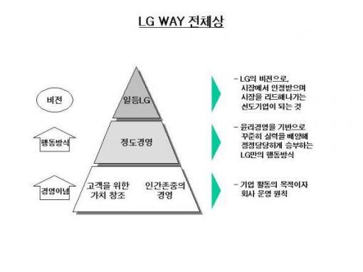 LG가 밝힌 LG WAY란 한마디로 △경영이념인 '고객을 위한 가치창조'와 '인간존중의 경영'을 △LG의 행동방식인 '정도경영'으로 실천함으로써 △궁극적 지향점인 '일등LG'를 달성하자는 것으로 임직원의 사고 및 행동의 기반이 된다.