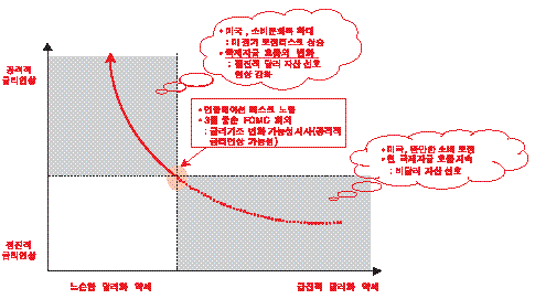 장화탁 동부증권 이코노미스트는 이날 보고서를 통해 "국제 유가가 고점을 돌파했고 실효환율 기준 달러화 가치는 사상 최저 수준까지 떨어진 뒤 반등했으며 미국 금리는 실질금리가 플러스로 돌아서는 3%대 진입을 앞두고 있다"고 지적했다.