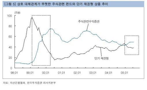 그는 "외환위기 이후 꾸준히 주가가 상승하고 있다는 사실과 금리 상승 가능성, 부동산 시장에 대한 정부의 부정적 입장 등으로 주식관련 금융상품에 관심이 꾸준히 늘 수 밖에 없다"며 "특히 증시 대세상승기에 나타날 수 있는 주식관련 펀드 증가와 단기채권형 수익증권 감소가 재현되고 있다"고 설명했다. 지난 1999년 상승기 단기 채권형 수익증권 잔고가 급감한 반면 주식관련 잔고가 급증했는데, 이런 현상은 상승의 초기단계에 불과했다고 강조했다.(그림 참고)