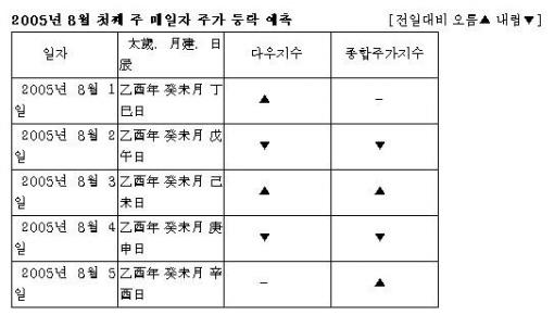 한편 월요일의 정사(丁巳)일과 금요일의 신유(辛酉)일도 각각 전일대비 주가가 하락하였지만 월일(月日)의 간지(干支)과 일치하는 사례가 하루에 불과하므로 등락을 장담하기는 어려운 상황이다. 다만 최근의 거침없는 주가 상승세에 제동을 거는 한 주 상황이 펼쳐질 것으로 전망된다.