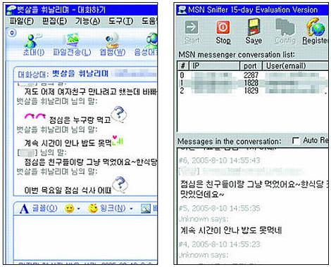 실험 대상으로 삼은 동료가 MSN 메신저로 누군가와 대화를 나누고 있는 내용이 컴퓨터 모니터에 속속 올랐다. 메신저 엿보기 프로그램을 기자의 컴퓨터에 설치하자 곧바로 벌어진 일이다.