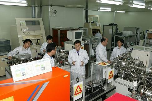 ◇실험실에서 '모트 금속-부도체 전이현상'에 대한 연구에 전념하고 있는 ETRI 테라전기소자팀. 강광용(오른쪽 두번째) ETRI 기반기술연구소 단말부품연구부장과 테라전기소자팀장인 김현탁 박사(오른쪽 세번째)가 연구원들과 얘기를 나누고 있는 모습.