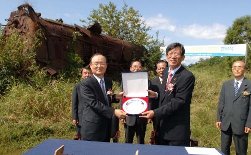 10호 기관차 앞에서 포스코 강창오 사장(왼쪽)이 유홍준 문화재청장으로 문화재 지킴이 위촉패를 받고 있다.