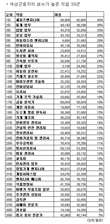세일즈엔지니어링 분야에선 여성 근로자가 8만9908달러를 받을 때 남성은 6만2660달러를 받아, 임금 격차가 43%에 달했다. 그 뒤를 잇는 직업은 통계관련 업무. 여성은 남성에 비해 35% 높은 4만9140달러를 받는 것으로 조사됐다.