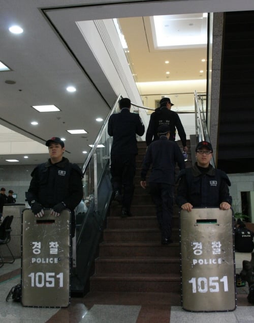 포스코 본사 건물 1층에는 경찰지휘본부 관계자들과 전투경찰, 포스코 관계자들이 노조원들의 상황을 시시각각 파악하고 있었다. 이들은 당초 '금방 끝나겠지'했던 불법점거가 장기간 지속되자 상당히 민감해진 상태였다. 전투경찰들도 교대를 해가며 노조와 대치 중이었지만 사태가 장기화되자 지친 기색이 역력했다.