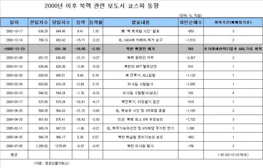 9일 증권선물거래소(KRX)에 따르면 북한의 핵개발 시인·봉인제거·NPT탈퇴·미사일 발사 등 2000년 이후 북핵관련 악재가 터진 14번의 사례 중 하루만에 전일지수를 회복한 경우는 6번(43%)에 달하는 것으로 집계됐다.