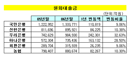 원화대출금 증가액에서도 우리은행과 하나은행의 증가세가 가장 돋보였다. 우리은행의 지난해말 여신잔액은 98조4930억원으로 전년말보다 24조2301억원(32.63%) 늘어나 가장 높은 증가세를 보였다. 이에 힘입어 여신잔액 기준으로 신한은행 농협을 제치고 2위로 올라섰다.