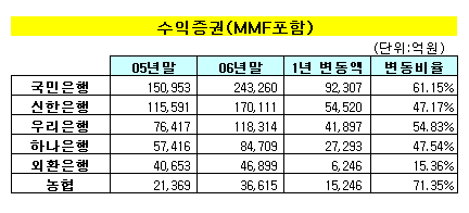 비이자수익분야인 수익증권에서는 국민은행과 농협이 두드러진 행보를 보였다. 지난해말 국민은행의 수익증권 판매잔액은 24조3260억원으로 전년말보다 9조2307억원(61.15%) 늘어나 절대적인 증가규모가 가장 컸다.