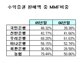 한편, 수익증권 판매액 중 MMF가 차지하는 비중은 전 은행이 감소했다. MMF는 다른 수익증권에 비해 수익성이 낮다. 지난해 우리은행의 MMF비중은 61.63%로 5개 은행평균 51.84%에 비해 다소 높았다. 그러나 전년말 68.20%에 비해 6%포인트 이상 감소했다. 지난해 농협은 MMF비중을 전년말 79.44%에서 50.86%로 대폭 줄였고, 하나은행도 52.74%로 5%포인트 가량 낮췄다.