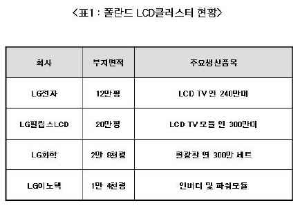 LG 폴란드 LCD클러스터에는LG전자(127,900원 ▲23,900 +22.98%)의 LCD TV 완제품 및LG필립스LCD(11,910원 ▲240 +2.06%)의 LCD모듈 조립라인이 들어섰다. LG화학의 편광판 세트, LG이노텍 및 3개 협력회사의 인버터와 파워모듈 등 LCD부품 생산라인도 함께 포진했다.