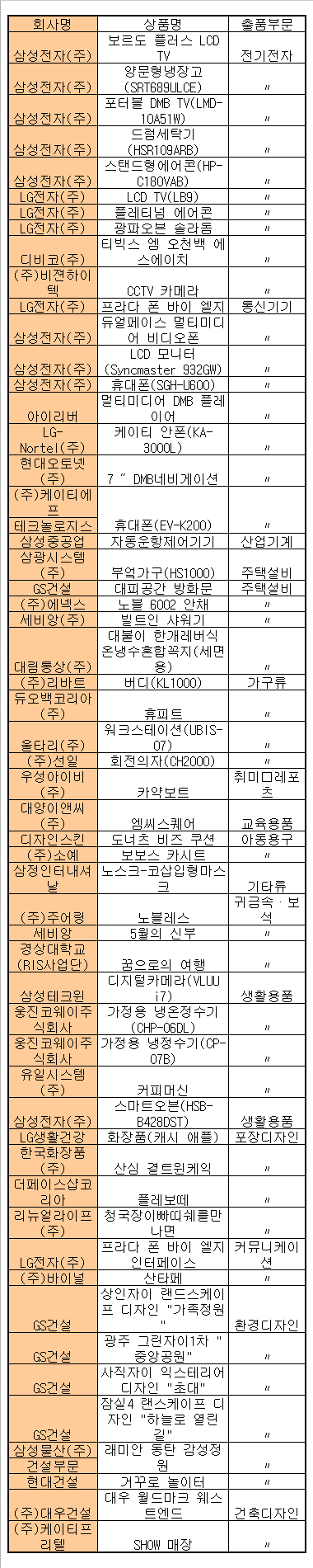 수상 후보인 55개 품목에는 삼성전자의 '보르도 플러스' 평면TV와 'SGH-U600' 휴대폰, LG전자의 '프라다' 휴대폰과 '플래티넘' 에어콘, KTF의 '쇼' 매장, 유일시스템의 커피머신, 세비앙의 빌트인 샤워기, LG생활건강의 화장품 '캐시 애플', 대우건설의 월드마크 웨스트엔드 등이 포함됐다.