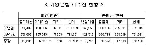 25일 은행권에 따르면 올 1~5월중 기업은행 여신은 중소기업대출 5조4203억원을 포함, 5조9492억원 늘었다. 그런데 저원가성 예금인 요구불예금을 포함, 핵심예금은 같은 기간 1조9745억원이나 줄었다.