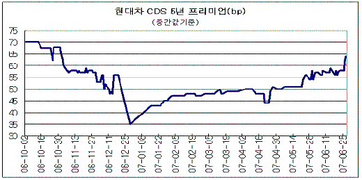 국제금융시장에서 거래되는현대자동차(485,000원 ▼32,000 -6.19%)신용파산스왑(CDS) 프리미엄이 급등한 것으로 나타났다. 연초부터 불거진기아차(161,700원 ▼6,800 -4.04%)유동성 위기설에다 최근 미국 서브프라임 모기지 문제가 다시 불거지면서 오름세가 눈에 띄게 가팔라졌다.