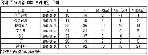 신용등급이 A인 삼성전자 한국전력 포스코는 이달들어 CDS 프리미엄이 각각 1bp, 2bp, 1bp 올랐고 A-인 KT는 2bp 상승에 그쳤다. 그러나 GS칼텍스(BBB+)는 12bp 급등했고, SK(BBB-)도 3bp 상승반전했다.