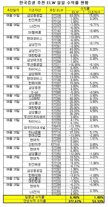 29일 증권업계에 따르면 한국증권이 6월1일부터 28일까지 하루 두종목씩 매수추천한 ELW의 일일평균 수익률이 6.40%에 달한다. ELW의 기초자산의 일일평균 수익률(1.40%)이나 코스피200(0.15%)보다 4.5배에서 42.6배 높은 수익률이다.