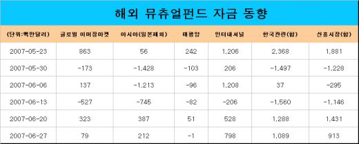 1일 전세계 뮤추얼펀드 조사기관인 이머징포트폴리오닷컴(EmergingPortfolio.com)에 따르면 최근 2주간(6월 14일~27일) 한국관련펀드로 총 23억7800만 달러가 유입됐다. 한국을 포함한 신흥시장 펀드로도 23억4400만 달러가 순수하게 들어왔다.