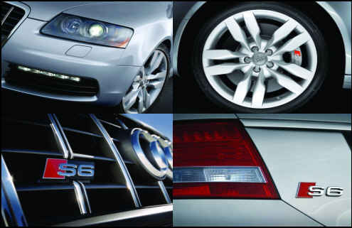 S6는 A6의 기본 보디라인을 유지하면서도 특유의 다이내믹하고 스포티한 개성을 곳곳에서 드러냈다. 아우디의 패밀리 룩인 싱글프레임 그릴에 붙은 S6 엠블럼과 19인치 전용휠, 4개의 머플러 등은 이 차의 고성능을 암시하고 있다.