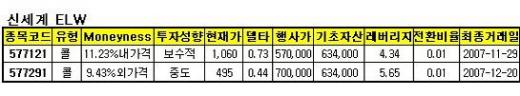 한국증권은 신세계를 기초자산으로 한 '7121콜ELW'와 '7291콜ELW'의 단기 상승이 기대된다고 밝혔다. 7121콜ELW는 행사가 57만원인 내가격 상태로 보수적인 투자자에게 적합하다. 7291콜ELW는 행사가 70만원의 외가격 상태로 최종거래일은 오는 12월 20일이다.