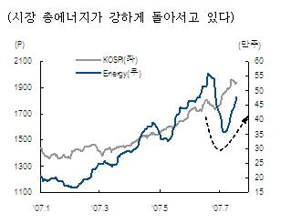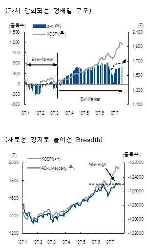또한 주식시장의 정배열구조의 정도를 나타내는 (p-n)차트가 7월 이후 다소 완만하지만 꾸준히 증가해 강세국면이 과열징후 없이 당분간 진행될 가능성이 높아졌다. 주식시장 내 상승종목의 전체규모를 나타내는 AD-Line의 경우, 2007년 2월 15개월 만에 상승세로 전환된 이후 지속적으로 상승하여 지난주에는 전고점을 갱신하였다.