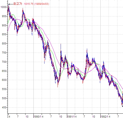 <1000돌파 후 코스피지수, 450대까지 하락>