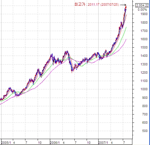 <1000돌파후 2000까지 돌파한 코스피지수>