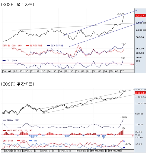 첫째, 장기 추세선에서의 저항 가능성이다. 1980년 이후 형성되어온 장기저항선(1989년, 1994년 고점을 이은 추세선)을 2007년 1/4분기에 돌파하면서 코스피는 크게 확장됐다. 이러한 급격한 추세확장으로 1997년 이후 형성된 장기상승 추세대(2100선)까지 지수가 근접해 가격측면에서 부담감이 커지고 있다.
