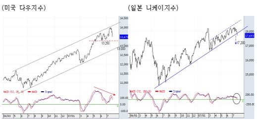 한편 꾸준한 상승세를 이어오던 일본증시(니케이지수)는 2006년 하반기 이후 형성된 중기 추세선이 붕괴되어 당분간 상승추세로의 회복이 불투명하게 됐다. 즉, 강력한 지지선의 붕괴로 상당기간 지지권역을 모색하는 과정이 진행될 것으로 보이며, 1차적으로 1만7200엔 수준이 단기 지지선이 될 것으로 보인다.