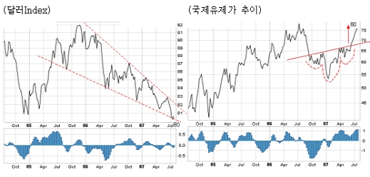이는 원/달러 환율의 흐름을 보면 보다 명백해진다. 2006년 이후 원/달러 환율하락(원화강세)이 지속되면서 완만한 하락추세를 형성하고 있다. 단기적으로 912원대에서의 반등으로 당분간 상승(원화약세)할 것으로 보이지만 추세전환 가능성은 그리 높지 않다. 미국채 금리도 Triangle패턴이 상승목표치인 5.2%까지 상승하면서 완성된 이후 가파르게 하락하고 있으나 재차 중기상승추세선이 위치한 4.7%대에서 강한 반등이 예상된다. 즉, 2005년 2분기 이후 형성된 금리의 상승추세는 상당기간 지속될 것으로 보인다.