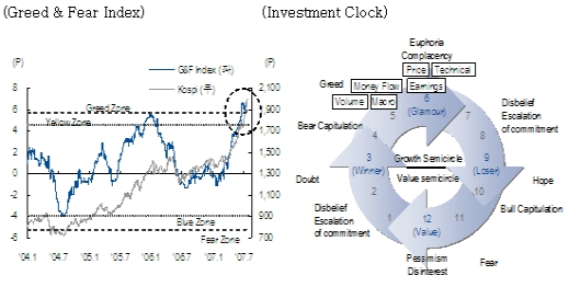 과거 Greed & Fear Index의 궤적을 보더라도 현재는(7월말) 지난 달에 이어 2005년 11월이나, 2006년 1월 수준을 뛰어넘는 수준으로 Investment Clock상 6시에 근접했다. 이 수준은 투자자들이 'Euphoria'(행복감)에 젖어 있는 단계로 주식시장의 과열을 식히는 과정이 필요한 시점이다. 다행스러운 것은 지수가 횡보하면서 Greed & Fear Index가 하향 안정화될 가능성이 남아있다는 점이다.